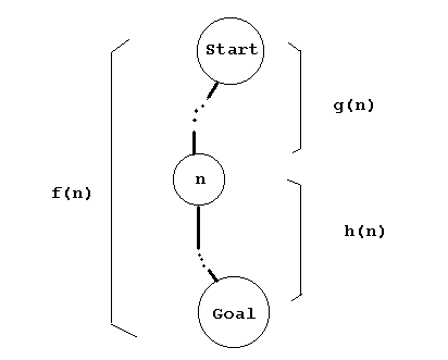 where g(n) represents the (computed, actual) cost of getting to the node n along the current path to it, and h is the heuristic function. Thus, f(n) estimates the cost or effort to successfully get from start to goal by going through node n (along some particular path)
